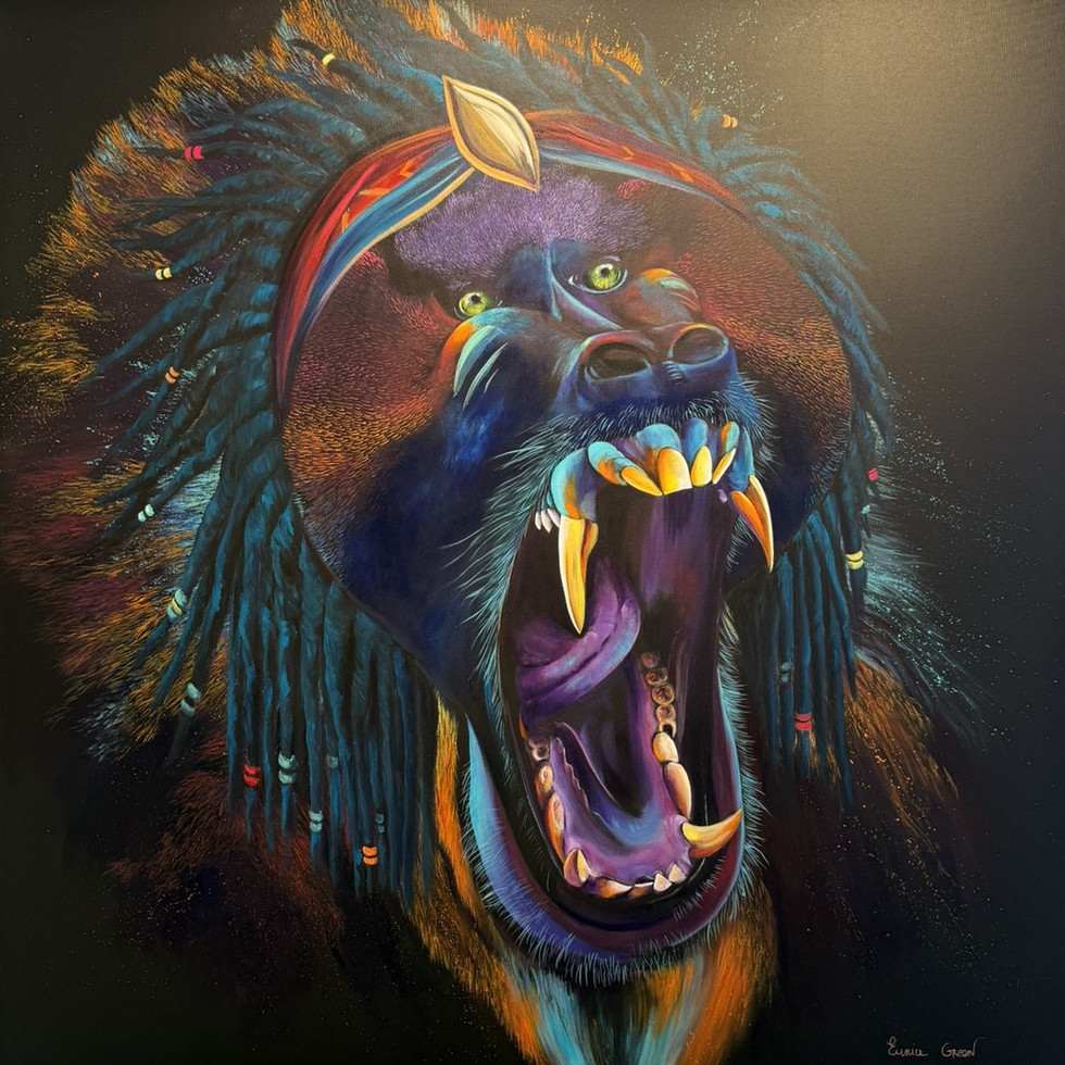 Le bandeau et le diadème font écho aux tradition royales africaines, intégrant une dimension culturelle forte qui souligne non seulement la dignité de l'animal, mais aussi son rôle en tant que symbole de résistance. Les dreadlocks, souvent associés à des mouvements culturels et identitaires, ajoutent une couche supplémentaire de signification, liée à l'identité et à la lutte contre l'oppression.